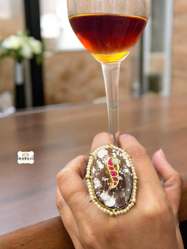 This expertly designed ring showcases a harmonious blend of intricate craftsmanship and striking design. Featuring a prominent oval centerpiece enhanced by delicate patterns and a pearl border, the piece exudes sophistication and charm. Perfect for both special occasions and daily wear, this ring is a timeless addition to any jewelry collection.