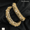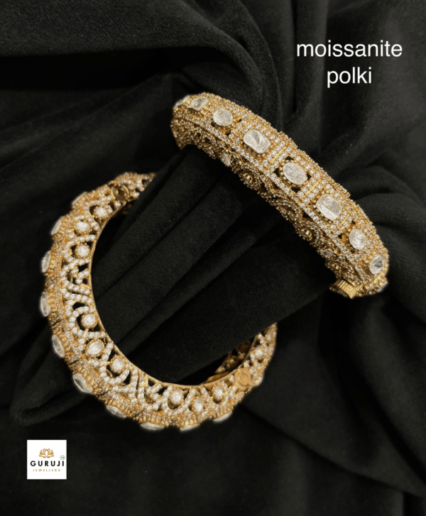 Introducing our exquisite Moissanite Polki Bangles, a true testament to fine craftsmanship and timeless elegance. Each bangle is meticulously adorned with sparkling moissanite and polki stones, creating a dazzling display of brilliance. The intricate design showcases a perfect blend of traditional artistry and contemporary style, making these bangles a versatile addition to your jewelry collection. Ideal for special occasions or everyday wear, these bangles are sure to make a statement and elevate any ensemble. Experience the allure of luxury with our Moissanite Polki Bangles, exclusively from Guruji Jewellers.