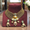 This intricately designed choker necklace set showcases fine craftsmanship with detailed metalwork and elegant embellishments. The statement piece is adorned with beautifully arranged stones and intricate motifs, making it a perfect blend of tradition and sophistication.