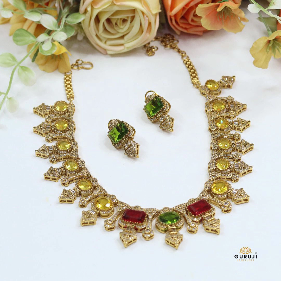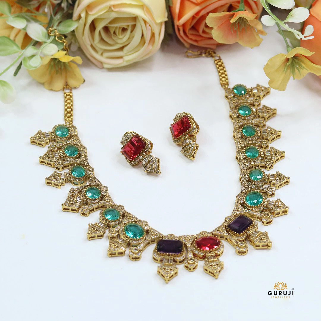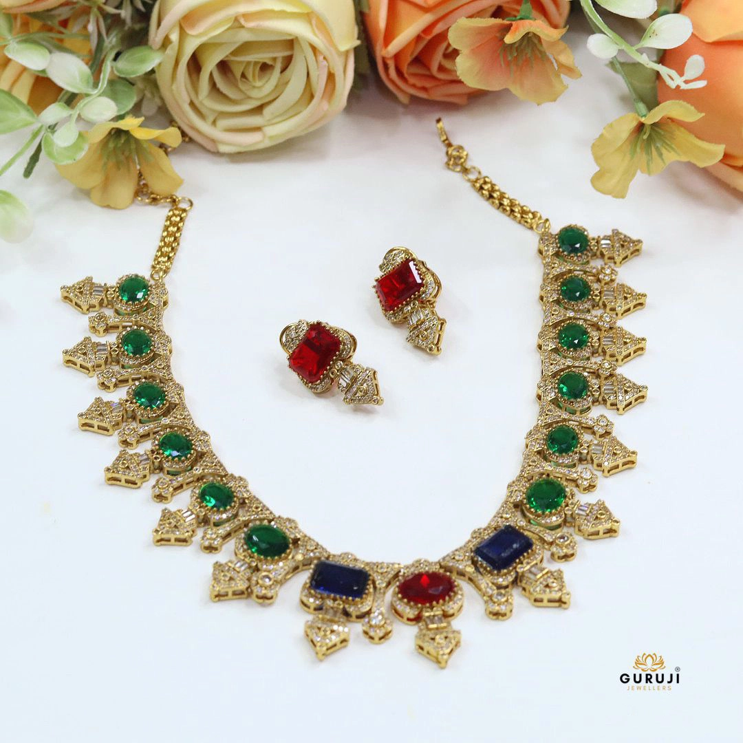 This Sabyasachi-inspired necklace set is a masterpiece of traditional artistry and modern luxury. Adorned with rich gemstones in hues of ruby red, emerald green, and sapphire blue, each stone is framed with delicate Cz detailing. The bold design is paired with matching earrings, making it an ideal choice for brides, wedding receptions, and festive celebrations. A statement piece that reflects heritage, sophistication, and timeless beauty.