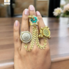 This beautifully crafted triple ring set showcases exceptional artistry, with three interconnected rings adorned with intricate designs and delicate embellishments. Each ring features a unique motif, enhanced by the fine detailing and thoughtful placement of small accents. The rings are gracefully connected by slender chains, further embellished with small charms for added sophistication. This statement piece seamlessly blends elegance and individuality, perfect for making a lasting impression on any occasion.